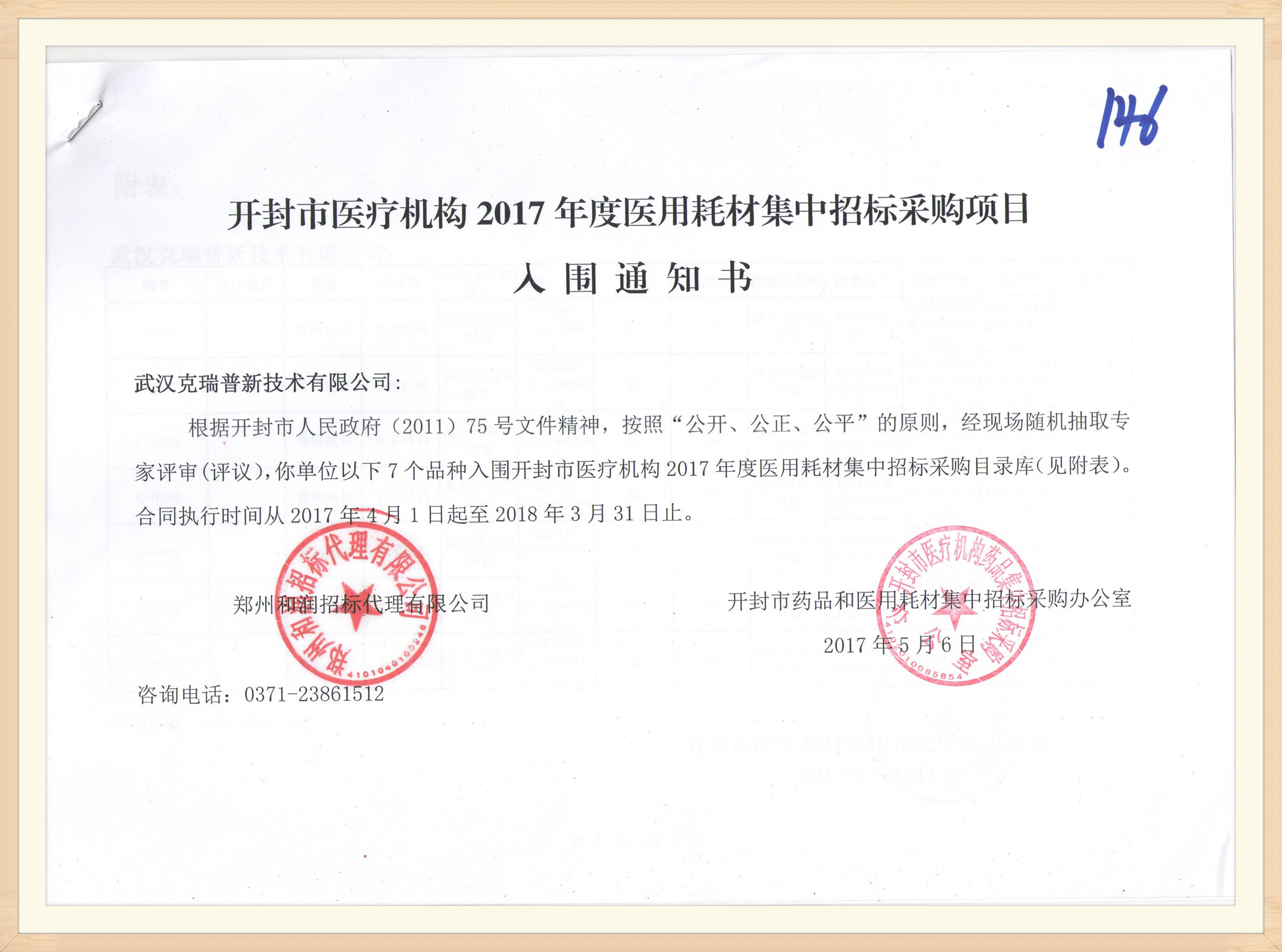 河南省開封市醫(yī)療機構2017年度醫(yī)用耗材集中采購項目入圍通知書