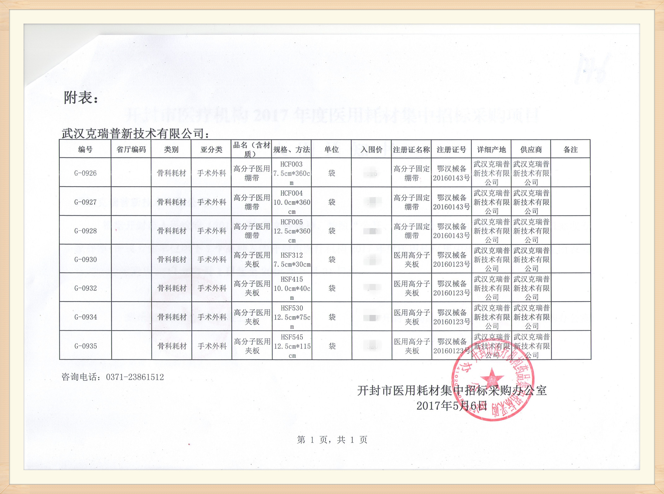 【河南省開封市醫(yī)療機構2017年度醫(yī)用耗材集中采購項目】經(jīng)過我們武漢克瑞普新技術有限公司招標的同事辛苦努力下已在在根據(jù)開封市人民政府75號文件精神,經(jīng)現(xiàn)場隨機抽取專家(評議)我公司的東科圣康品牌高分子夾板以及高分子繃帶產(chǎn)品已成功入圍開封市醫(yī)療機構醫(yī)用耗材集中采購目錄庫。