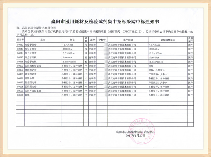 【湖北省襄陽市醫(yī)用耗材及檢驗(yàn)試劑集中招標(biāo)采購(gòu)中標(biāo)通知書】武漢克瑞普新技術(shù)有限公司在參加襄陽市醫(yī)療機(jī)構(gòu)醫(yī)用耗材集中招標(biāo)采購(gòu)項(xiàng)目中經(jīng)評(píng)定我們公司已成功中標(biāo),我們的中標(biāo)產(chǎn)品有高分子繃帶、高分子夾板、醫(yī)用外固定支具等多種骨科耗材產(chǎn)品,我們的骨科耗材系列產(chǎn)品都有國(guó)家出具的證書全套的資質(zhì)齊全,可適用于胸外科、骨科、急診科、理療科、整形科、120急救等。