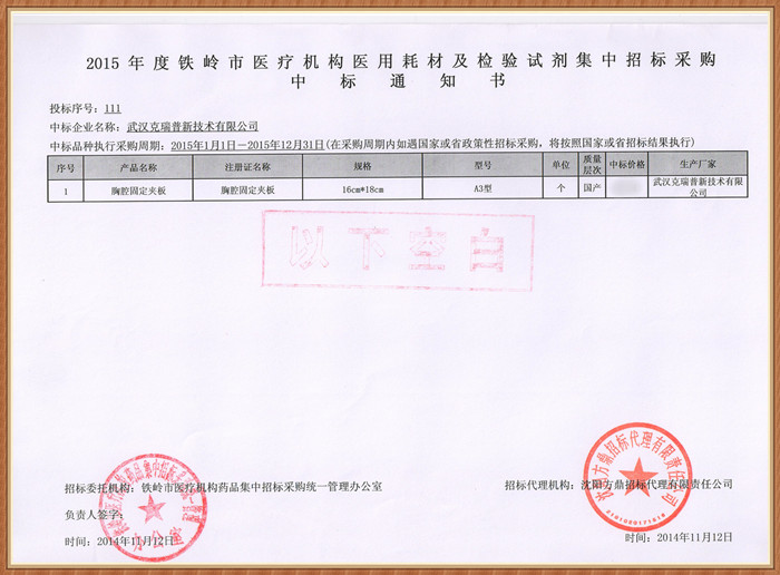 【遼寧省2015年度鐵嶺市醫(yī)療機(jī)構(gòu)醫(yī)用耗材及檢驗(yàn)試劑集中招標(biāo)采購中標(biāo)通知書】我們東科圣康品牌的胸腔固定夾板術(shù)前術(shù)后外固定耗材在2015年度鐵嶺市醫(yī)療機(jī)構(gòu)集中采購中已成功中標(biāo),中標(biāo)價(jià)格較為優(yōu)惠產(chǎn)品醫(yī)生操作起來比較簡單,而且可以提升接診率,產(chǎn)品輕便舒適等特點(diǎn)。