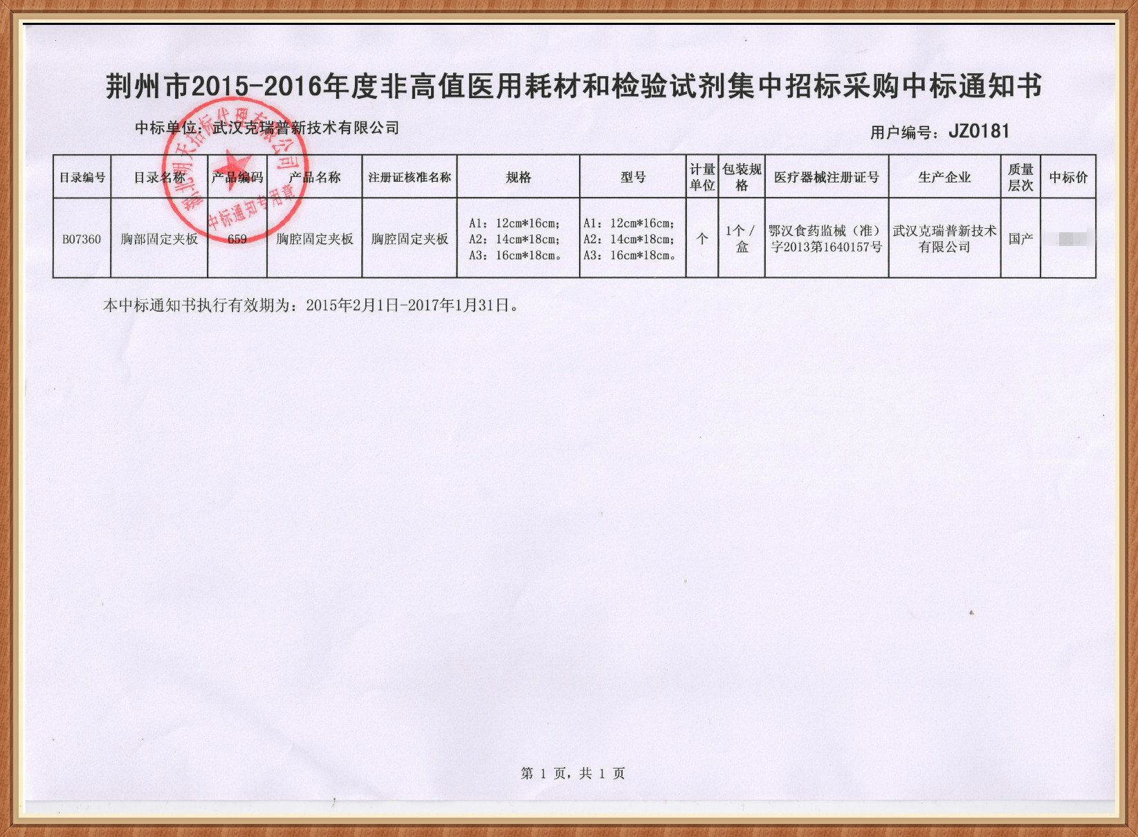 【湖北省荊州市2015-2016年度非高值醫(yī)用耗材和檢驗試劑集中招標(biāo)采購中標(biāo)通知書】武漢克瑞普新技術(shù)有限公司在荊州市醫(yī)療機(jī)構(gòu)非高值醫(yī)用耗材和檢驗試劑集中招標(biāo)采購項目中我司經(jīng)評標(biāo)委員會的評審決定成功獲得了中標(biāo)的資格,我們本次中標(biāo)的產(chǎn)品是我廠家較為關(guān)注的一款產(chǎn)品那就是我們的東科圣康品牌的胸腔固定夾板產(chǎn)品,這款產(chǎn)品在醫(yī)院以臨床使用中較為良好,我們歡迎各大經(jīng)銷商與我們?nèi)〉煤献鳌?/span>