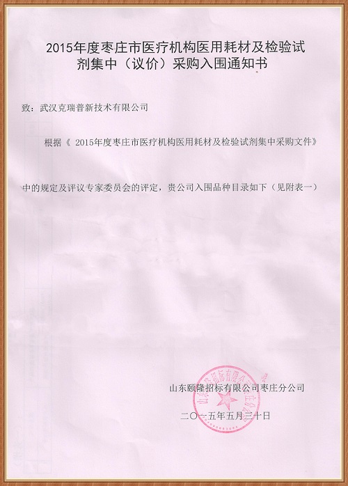 【山東省2015年度棗莊市醫(yī)療機(jī)構(gòu)醫(yī)用耗材及檢驗(yàn)試劑集中(議價(jià))采購入圍通知書】武漢克瑞普出品的胸腔固定夾板經(jīng)過委員會專家評定,我公司的產(chǎn)品成功中標(biāo)入圍,本次中標(biāo)產(chǎn)品數(shù)量較少我們的胸骨固定板是由高分子納米材料、記憶鋁合金板、多頭胸背部肋骨固定帶等組成,使用方便患者使用過程中不會感到有束縛感同時(shí)還可以緩解患者的呼吸。
