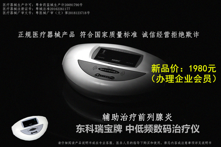 前列腺治療儀哪款好?專(zhuān)業(yè)人士提醒購(gòu)買(mǎi)理療康復(fù)產(chǎn)品,還是請(qǐng)選擇正規(guī)器械生產(chǎn)廠家、資質(zhì)齊全的產(chǎn)品為妥。(2019新款上市)東科瑞寶牌前列腺儀器產(chǎn)品(輔助治療前列腺炎專(zhuān)用中低頻數(shù)碼治療儀)新品上市,銷(xiāo)售價(jià):1980元/套(辦理企業(yè)會(huì)員,享受會(huì)員服務(wù)與權(quán)益),該家用型治療儀器為二類(lèi)準(zhǔn)字醫(yī)療器械產(chǎn)品,采用多級(jí)性中低頻復(fù)合脈沖,符合國(guó)家YY0505標(biāo)準(zhǔn)電磁兼容有關(guān)要求,該治療儀器使用220v交流電源,具有耐壓4000伏和上電無(wú)輸出自鎖的安防功能, 廠家一年三包質(zhì)保售后,可適用于家庭、中小醫(yī)療機(jī)構(gòu)、鄉(xiāng)鎮(zhèn)醫(yī)院、社區(qū)診所理療科室等。