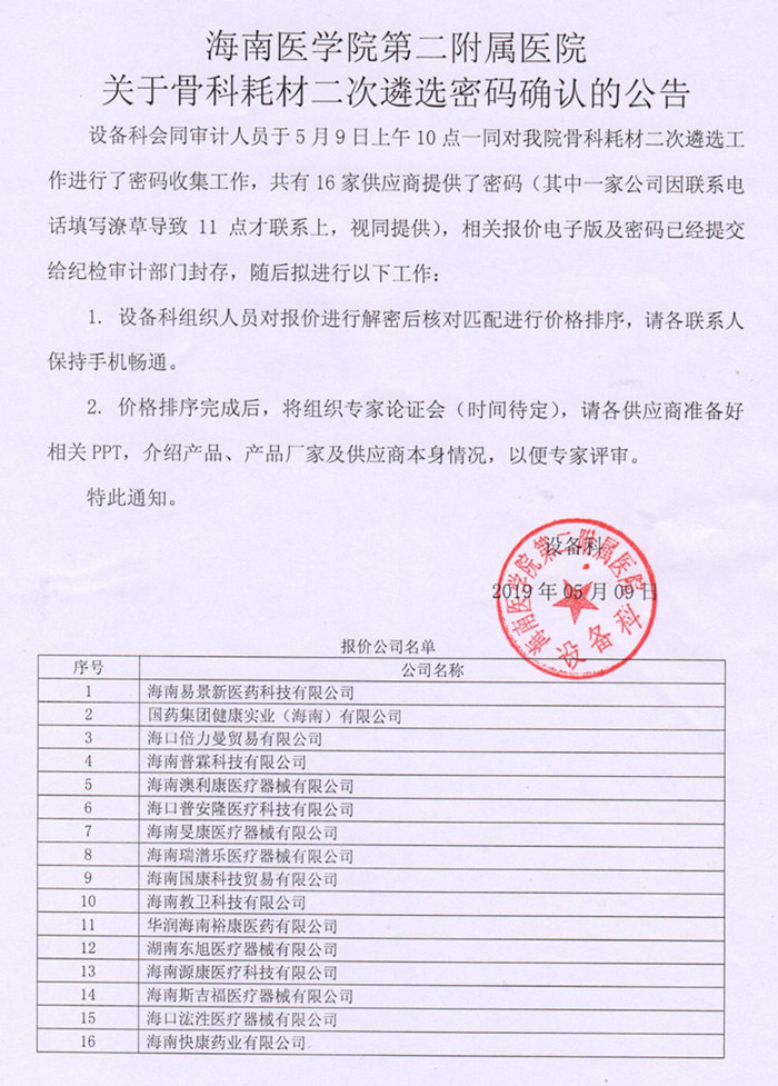 海南醫(yī)學院第二附屬醫(yī)院設備科會同審計人員于5月9日上午10點,一同對我院骨科耗材二次遴選工作進行了密碼收集工作,共有16家供應商提供了密碼(其中一家公司因聯(lián)系電話填寫潦草導致11點才聯(lián)系上,視同提供),相關報價電子版及密碼己經(jīng)提交給紀檢審計部門封存,隨后擬進行以下工作: