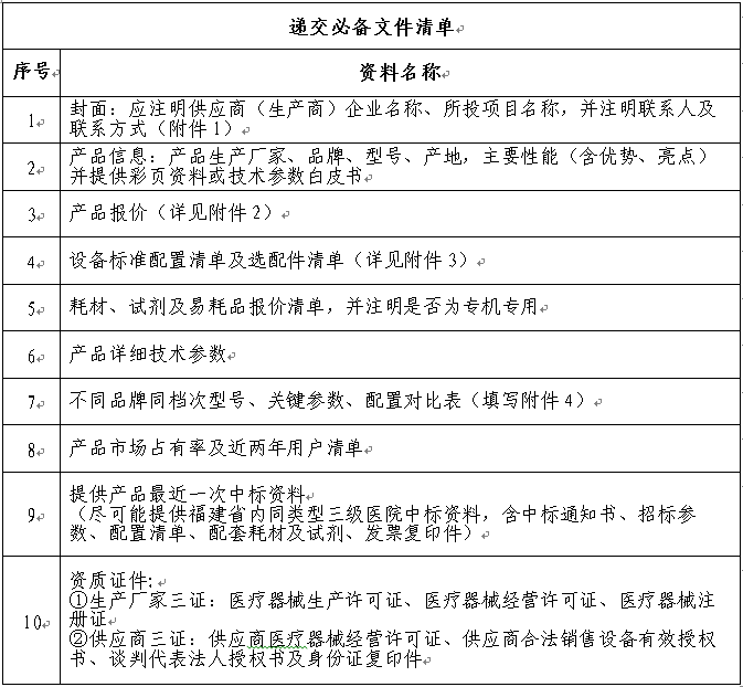 備注:1-10項(xiàng)均為必備資料,按項(xiàng)目內(nèi)容順序排列,并注明頁碼,膠裝成冊。若無法提供該項(xiàng)目文件,請(qǐng)?jiān)谠擁?xiàng)所對(duì)應(yīng)的頁面上填寫情況說明。所報(bào)名產(chǎn)品只接受一次報(bào)價(jià),請(qǐng)供應(yīng)商務(wù)必保證所填信息真實(shí)準(zhǔn)確(附件請(qǐng)參照模板如實(shí)填寫),我院將組織工程師對(duì)投遞產(chǎn)品資料進(jìn)行嚴(yán)格審核,若有弄虛作假或其他問題將按照相關(guān)法律法規(guī)嚴(yán)肅處理。