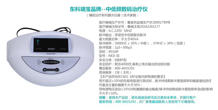 我們東科瑞寶品牌的前列腺治療儀是采用多級(jí)性中低頻復(fù)合脈沖電流,根據(jù)前列腺疾病治療的特性,由專門設(shè)計(jì)的電腦程序控制中頻脈沖電流3000Hz-至低頻脈沖電流370Hz之間不斷變頻轉(zhuǎn)換,利用專用理療電極片等配件耗材輸出,并通過(guò)特定穴位經(jīng)絡(luò)釋放,起到輔助治療前列腺炎等疾病的作用。