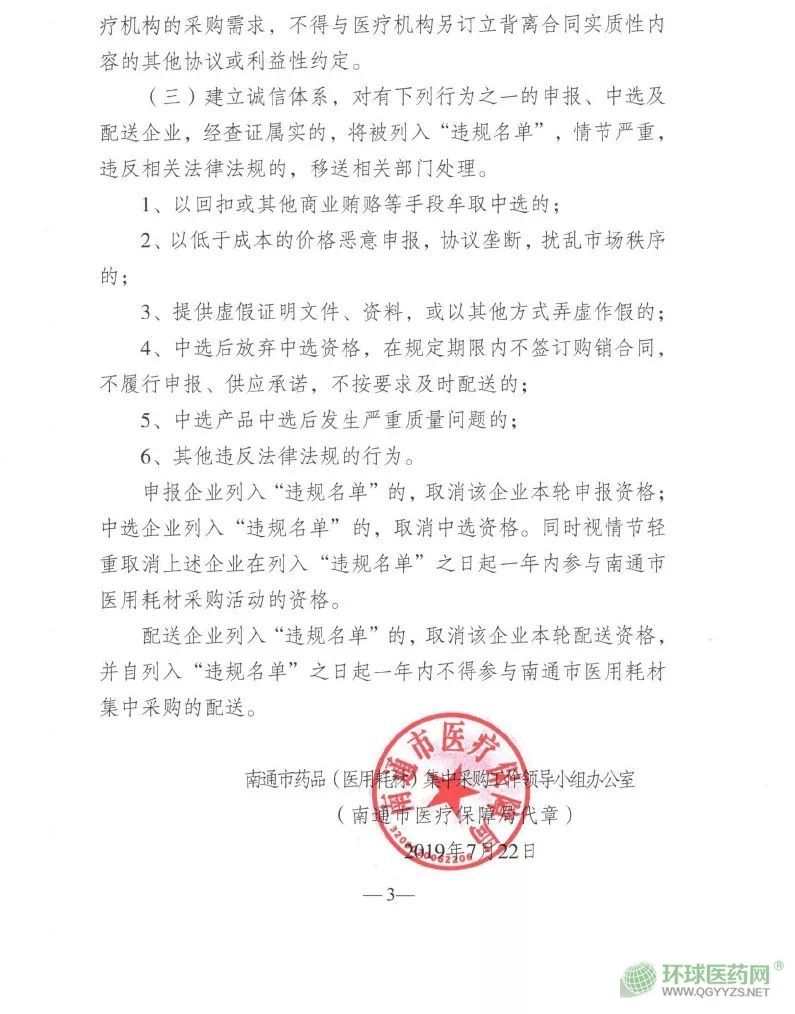 此外,南通市建立違規(guī)名單以及加強(qiáng)誠(chéng)信體系,涉賄、惡意競(jìng)爭(zhēng)、中選后出現(xiàn)嚴(yán)重質(zhì)量情況等將被列入違規(guī)名單,生產(chǎn)經(jīng)營(yíng)企業(yè)一年內(nèi)不得參與南通市的耗材招標(biāo)采購(gòu)活動(dòng)。