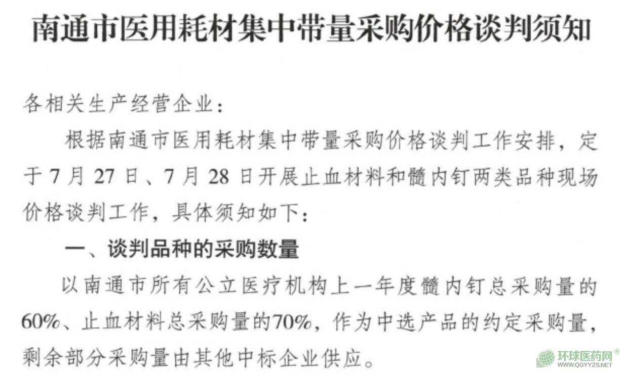 根據(jù)南通市的“價(jià)格談判須知”,約定髓內(nèi)釘?shù)牟少?gòu)量為2018年度全市醫(yī)院總采購(gòu)量的60%,止血材料的采購(gòu)量為2018年度總采購(gòu)量的70%,剩余部分采購(gòu)量由其他中標(biāo)企業(yè)供應(yīng)。
